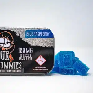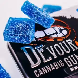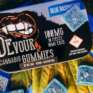 Devour Blue Raspberry Gummies. At their core, these gummies are cannabis-infused edibles that combine mouthwatering blue raspberry flavor with carefully measured THC doses. Each pack contains 100mg THC total, divided into 10 gummies with 10mg THC each. This makes dosing easy and consistent—something that’s especially important when consuming edibles.